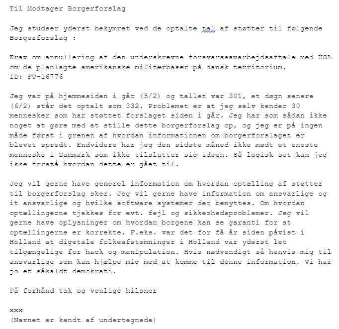 Jeg har modtaget bekræftelse at min støtte til forslaget er registreret. Så god gammeldags post virker altså stadig 😉